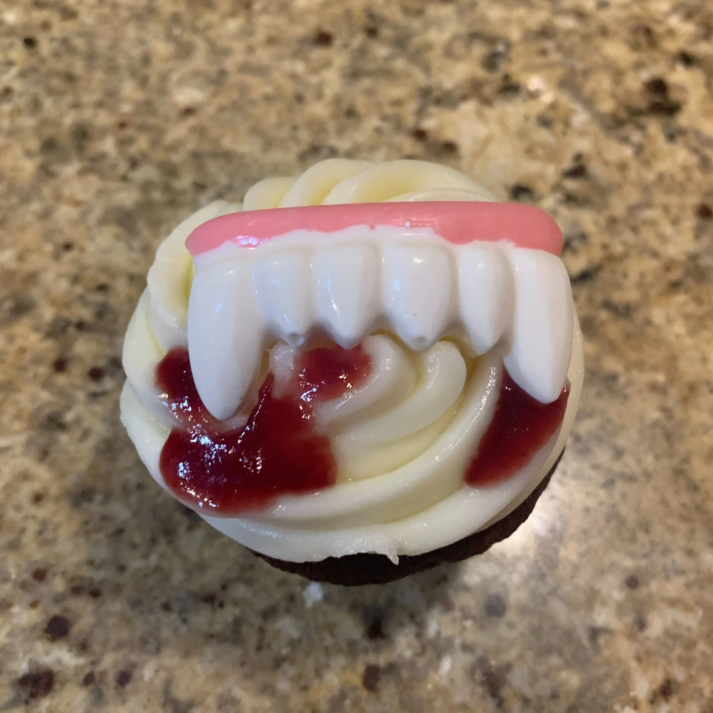 Carrot Cake Cupcake with your choice of Vanilla Buttercream or Cream Cheese Frosting and Chocolate Teeth