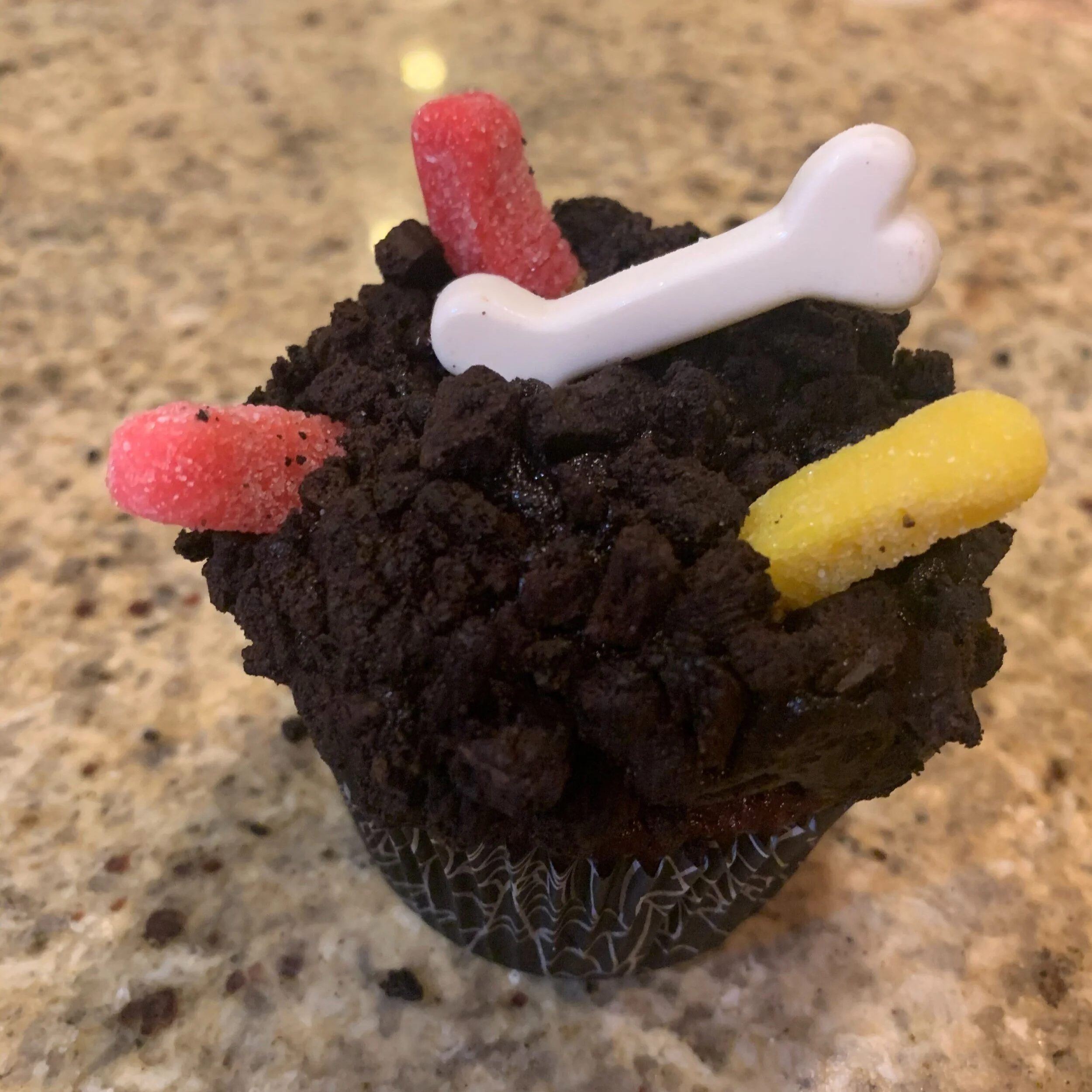 Oreo Chocolate Cupcake with Oreo Buttercream, Oreo “Dirt”, and Chocolate Bones